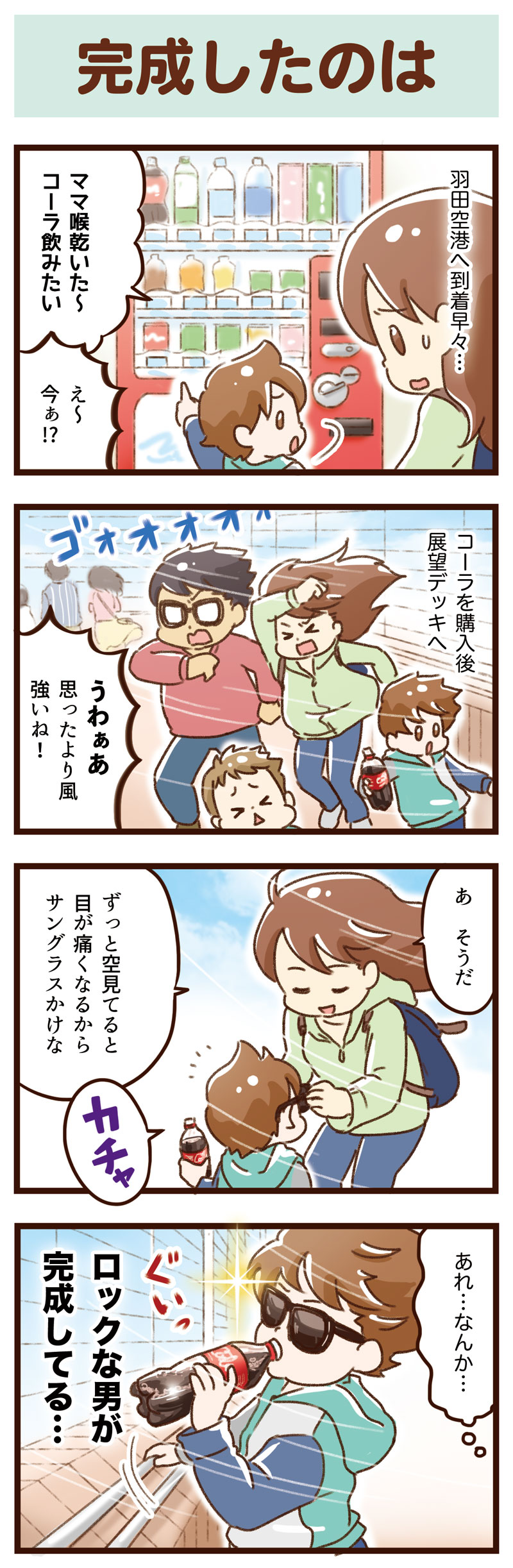 2017年06月02日 完成したのは〇〇な男 旅行記・最後です!羽田空港に行ってきました。 飛行機に乗ってどこかへ行くのではなくて、ただ展望デッキで離着陸の様子を眺めるだけです。結構楽しめますヾ(´ω`=´ω`)ノ強風+コーラ+サングラスたまたま重なったアイテムでロックな男が完成していました…。空港に来たらハンバーガー♡(謎のルール) GW旅行記、これにて終了です。次回からいつもの4コマに戻ります。★ランキング参加中★ポチッと応援お願いします(・∀・)つ 「日々」カテゴリの最新記事 < 前の記事次の記事 > コメント コメント一覧 (6) 6. ゆむい 2017年06月05日 14:22 マリさん おおお!近くに空港があるの、羨ましいです〜! いつでも近くで飛行機見れるなんて、うちの子供たちきっと大喜びですよ(^▽^) そうそう、羽田は展望デッキ以外にもお店が色々充実してるから ウィンドウショッピング感覚でウロウロできて、気づいたら1日経ってました(笑) 誘惑が…たくさん… 5. ゆむい 2017年06月05日 14:18 フクミーさん ここでギターかマイク持たせたら完璧だったw (実際は飛行機のおもちゃ…笑) 4. ゆむい 2017年06月05日 14:17 チャムスキーさん コメントありがとうございます! コーラ、お誉めいただいて嬉しいです…(笑) 気まぐれ更新のブログですが、 また暇つぶしに遊びにきてくださ〜い♡ 3. チャムスキー 2017年06月04日 00:18 初見で初コメ失礼します🍀✨ ソフトで可愛いタッチの絵でいいなぁ〜( ˶´⚰︎`˵ )なんて見ていたらコーラの再現度の高さに関心しすぎて思わずコメントしてしまいました(⸝⸝⸝ᵒ̴̶̷ ⌑ ᵒ̴̶̷⸝⸝⸝)✨! 最後の息子さんの飲んでるコーラの傾いた中身の部分と底の部分!!妙なリアルさに思わず引き込まれて何度見もしてしまいます(笑)すごい(*´ο`*)!! …って変な所に突っ込んですみません💦 これをキッカケに絵日記また見させてもらいますね😊🎵 2. フクミー 2017年06月03日 10:25 ロックな男w 偶然が重なった結果素敵にw 1. マリ 2017年06月03日 01:16 空港に飛行機を見に行くんですね。 私は、うちから空港から車で10分弱のとこに住んでるので、なんて斬新な!と思ってしまいましたが… 男の子なら飛行機だったり電車だったりが好きだったりしますよね。 特に空港だと食べ物とか色々あるしね。 ROCKな男(笑)可愛い〜 因みに、うちは千歳空港の近くです! コメントフォーム 名前 コメント 記事の評価 リセット リセット 顔 星 情報を記憶 コメントを投稿する