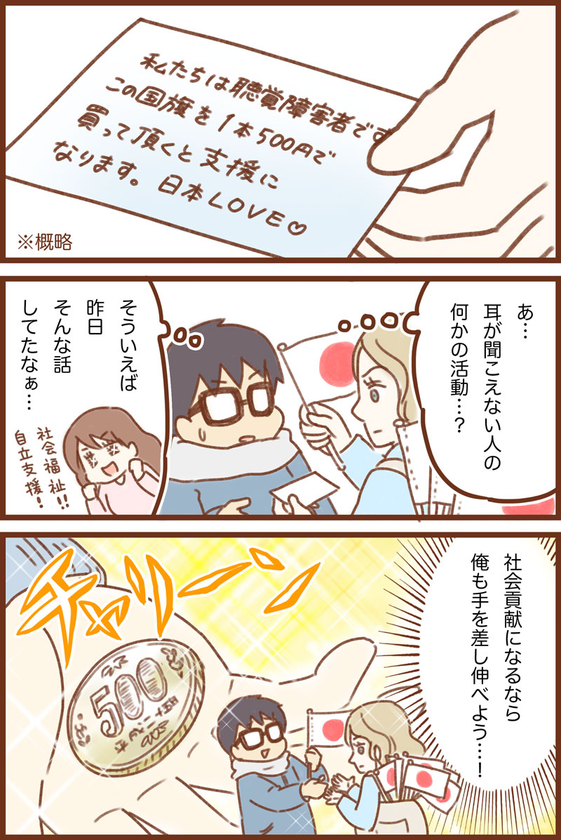 募金する事で何か代償を受け取ったけどそれが嘘だったり