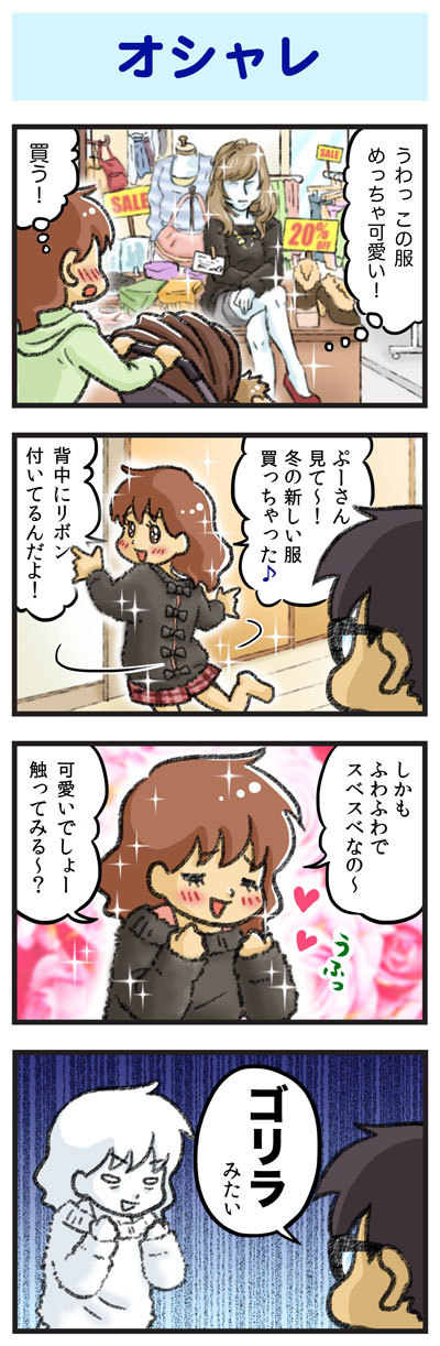 2014年12月07日 オシャレ ゴ…ゴリラ…?もう二度と着るもんか。黒いふわもこトップスには皆さんもご用心ください。★ランキング参加中★ポチッと応援お願いしますヘ(゚∀゚*)ノ 「日々」カテゴリの最新記事 タグ :#ぷーさん < 前の記事次の記事 > コメント コメント一覧 (6) 6. ゆむい 2014年12月09日 11:40 >めぐっぺさん コメントありがとうございます(*^v^*) モミの木、コースターって、なんだかピンポイントすぎてもっと意味不明な事態になってますね!笑 素敵なセンスです!!:*:・( ̄∀ ̄)・:*: 4コマは初心者なので至らない所だらけですが ありがとうございます(/ω\) めぐっぺさんの所にもまた遊びにいかせていただきますっ! 5. めぐっぺ 2014年12月09日 00:47 素敵なお洋服だったのに、ゴリラとか…ショックですよね。うちの父ちゃんも、もみの木みたいだ、場末のスナックのコースターみたいだと訳のわからないこと言ってきます! イラストもすごくお上手で、見とれてしまいました!勉強になります。すごいですね!! 4. ゆむい 2014年12月08日 17:08 >そらさん お気遣いありがとうございます~(´□`。) 治ったと思ったらまた発熱したので大人しくしてます(笑) 旦那って生き物はどうして嫁に冷たいんでしょうね… 単にオウム返しで「可愛い」と言えばいいだけなのに!(/TДT)/ 3. ゆむい 2014年12月08日 17:01 >あぃさん あぁ、なるほど! 旦那に可愛いさを訪ねたのがそもそも間違いですね。笑 もう放っときます(`・ω・´)ゞ 2. そら 2014年12月07日 21:06 うちの旦那もイラっとするコメントしかしてくれません…(-_-;) 体調、大丈夫ですか? 無理せず、お大事にしてくださいね。 1. あぃ 2014年12月07日 18:38 男子には女性の可愛いがわからないのです(▼∀▼) 男子がかっこいい!って騒いでる時に女性が「???」となるのと同じです コメントフォーム 名前 コメント 記事の評価 リセット リセット 顔 星 情報を記憶 コメントを投稿する トラックバック
