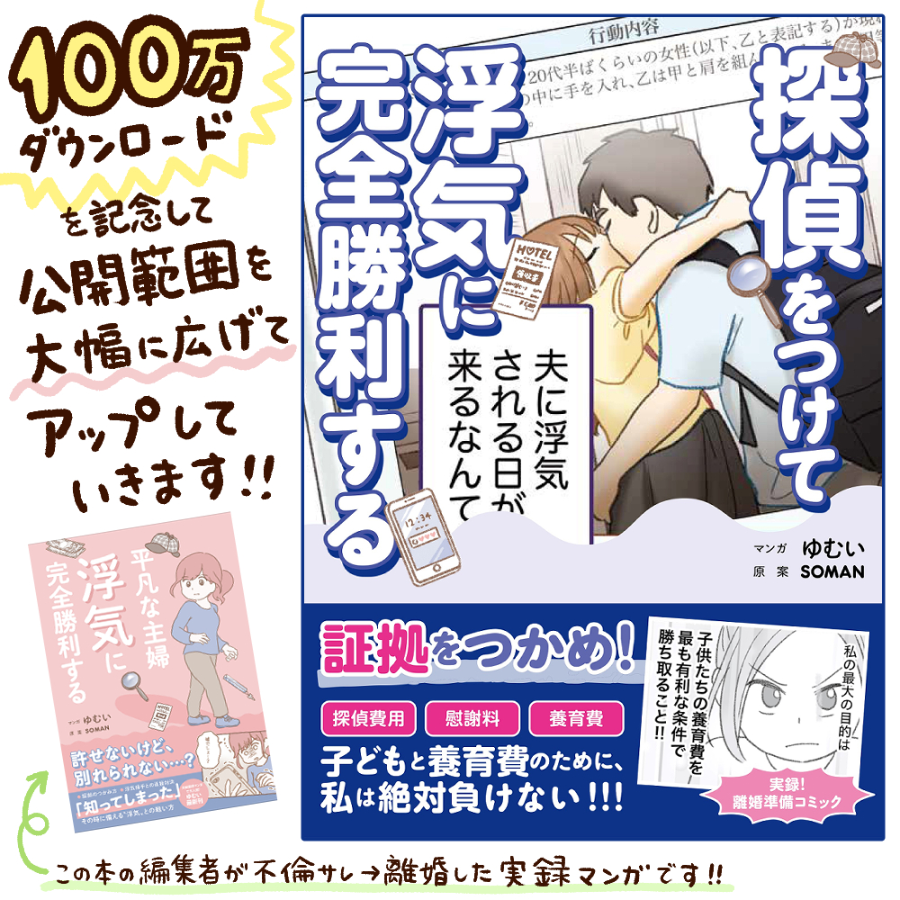 2025年06月17日 ⑧探偵をつけて浮気に完全勝利する 100万DL記念!探偵をつけて浮気に完全勝利する⑧です!①〜⑦までのおさらい では、⑧ どうぞ!⑨へつづきます。 書籍ではスッキリ完結済みです💖▶︎https://amzn.to/3CWTu9z◀︎ 「おしらせ」カテゴリの最新記事 < 前の記事次の記事 >